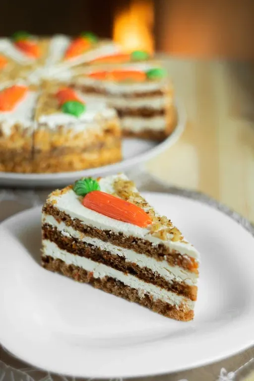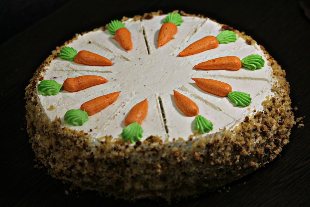 Торт "Морковный" 1,300 гр 640.50 руб. В корзину Бисквитный торт с добавлением изюма, дроблёных грецких орехов, тертой моркови и корицы, с нежным сырным кремом. Украшен декором в виде кремовых морковок и медовой крошки. Бисквитный торт с добавлением изюма, дроблёных грецких орехов, тертой моркови и корицы, с нежным сырным кремом. Украшен декором в виде кремовых морковок и медовой крошки.