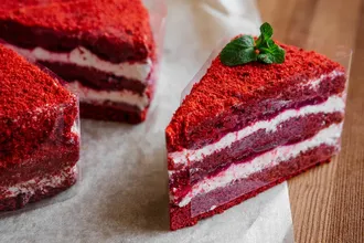 Торт из классического ярко-красного бисквита с добавлением какао и сливочного масла, с прослойкой из сырного крема и малинового конфитюра. Поверхность торта обсыпана красной бисквитной крошкой. Торт разделен на 10 равных частей, каждая из которых декорирована бордюрной лентой.